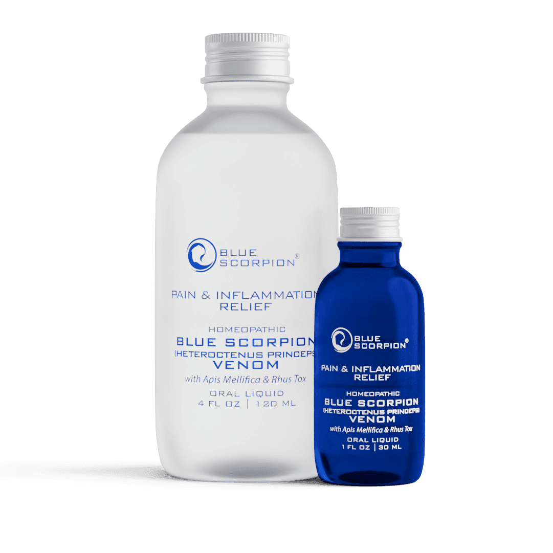 Blue Scorpion Pain & Inflammation Relief is a homeopathic formula which harnesses the power of Blue Scorpion Venom through a patented polarization process. Along with Apis Mellifica and Rhus Tox, this combination of ingredients offers temporary relief from pain and inflammation.